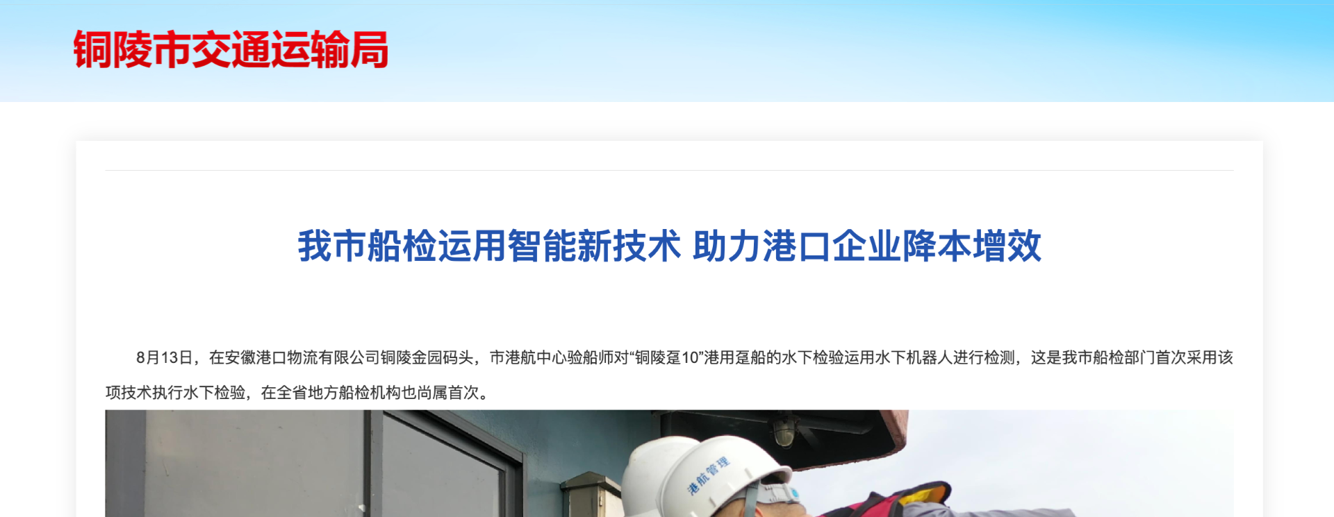 本产品在安徽省铜陵市交通局为“铜陵趸10”号进行首次水下机器人船检服务,水下机器人开展船舶检验为航运企业实现了“不停产”检验,推动航运高质量发展。